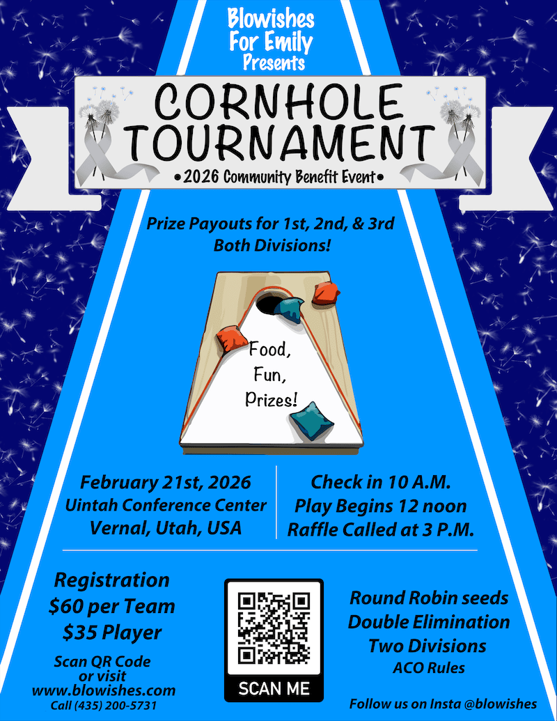 We're excited to invite you to our 2026 Charity Cornhole Tournament! Join us Saturday, February 21st Uintah Conference Center! Sign up on scoreholio below or at the door! Prizes, Games, Fun, Food, Raffle, and a great time for good cause!